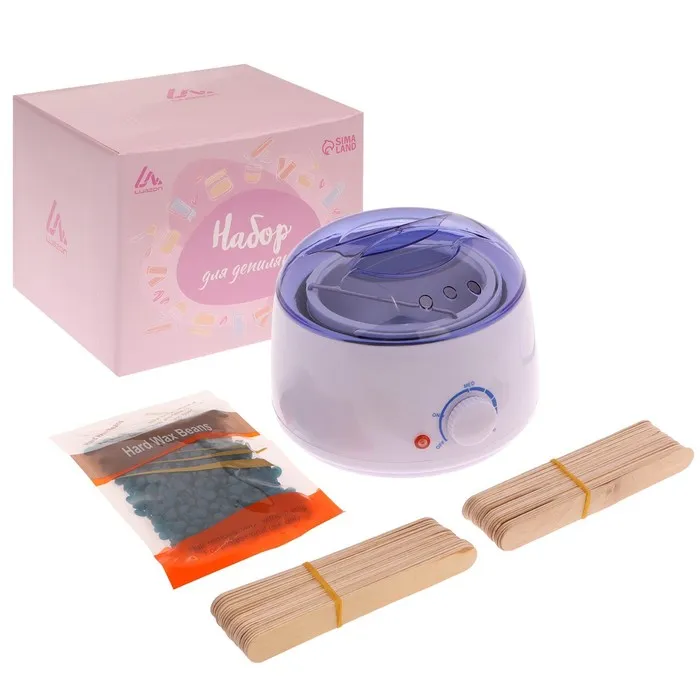 В комплекте с баночным воскоплавом есть всё необходимое: воск для депиляции в гранулах весом в 100 г и два набора шпателей по 25 штук.