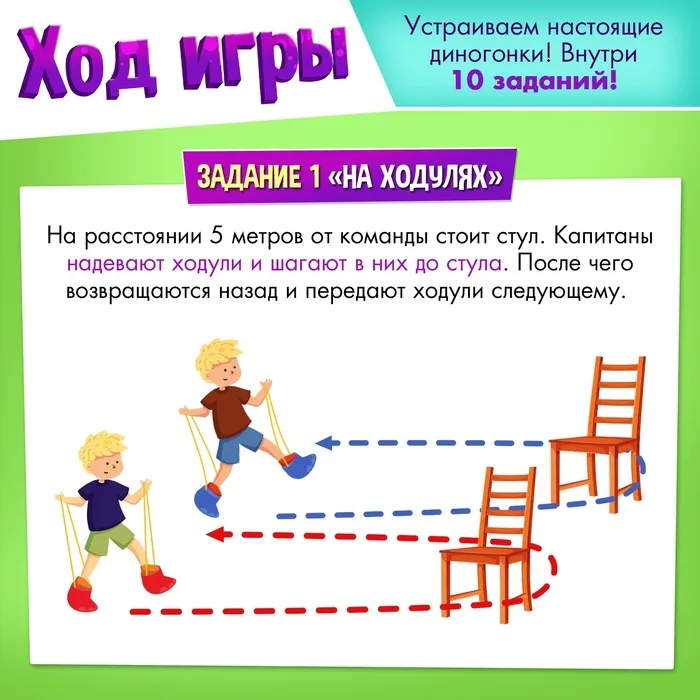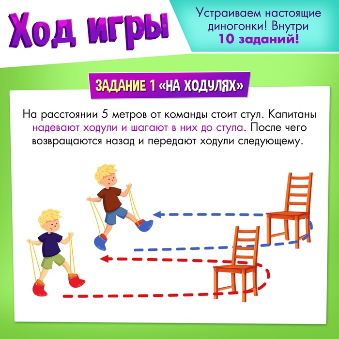 - Капитаны надевают ходули и шагают в них до стула, затем возвращаются назад и передают ходули следующему.