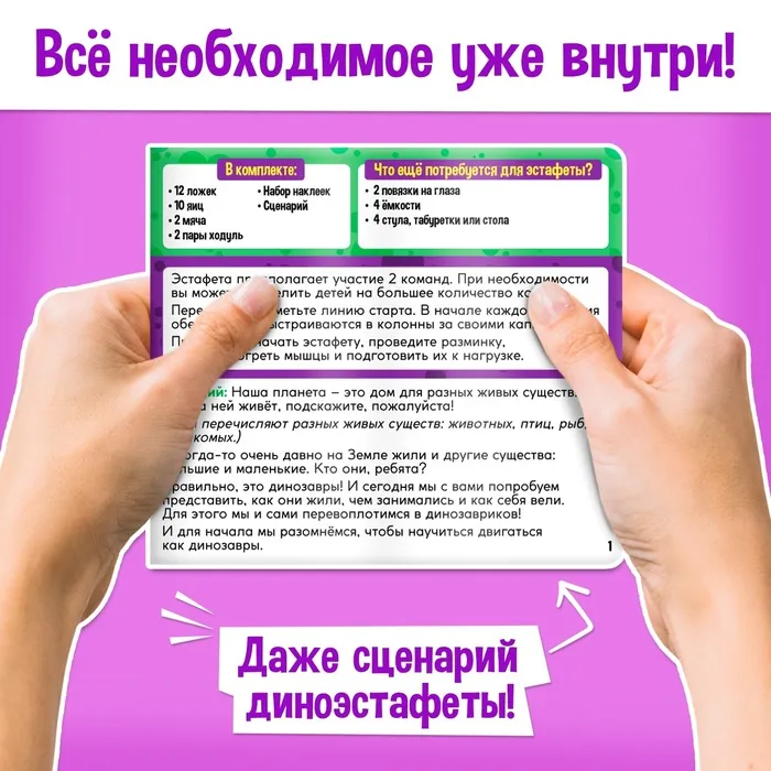«Диногонки» — набор для эстафеты для детей от 5 лет. Увлекательные соревнования увлекут маленького непоседу, зарядят энергией и отличным настроением. Озорные динозаврики поделятся на команды и будут выполнять интересные задания, чтобы узнать, кто самый ловкий и быстрый.