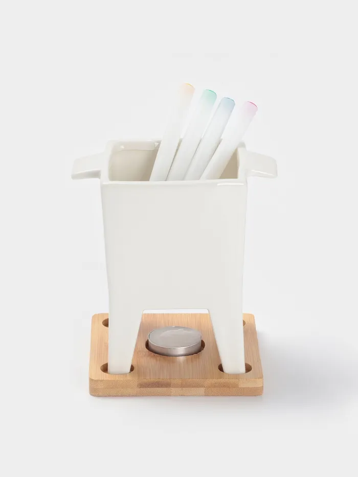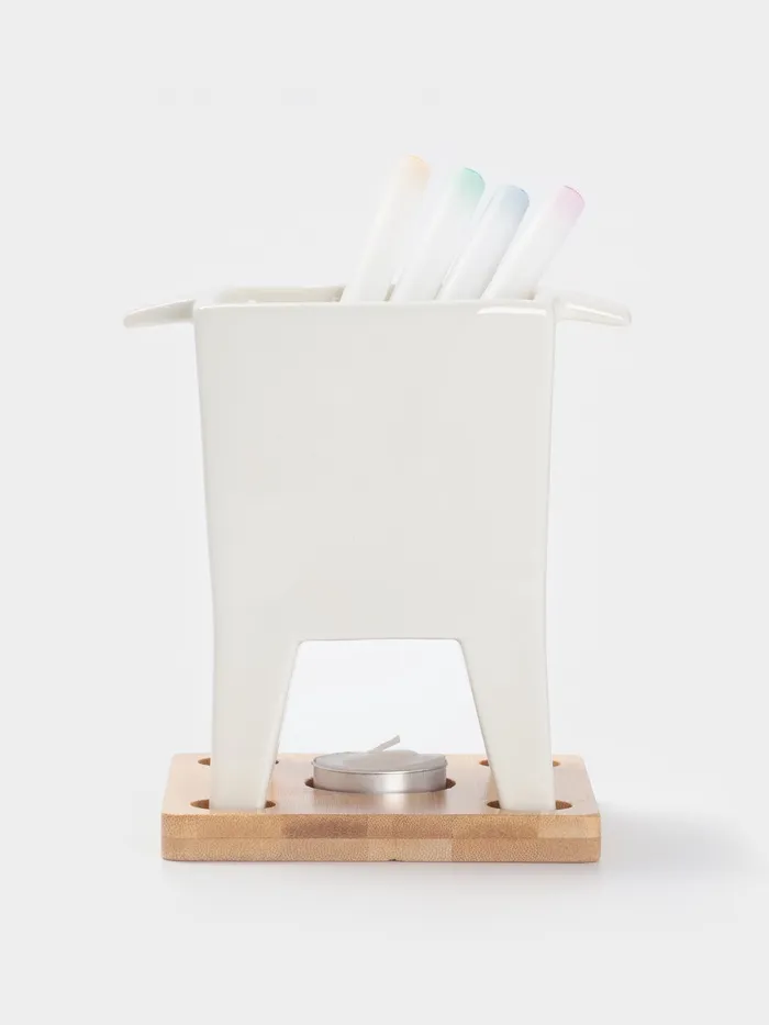 - В комплект входит: керамическая чаша (620 мл), 4 вилки для фондю, подставка и свеча для поддержания температуры.
