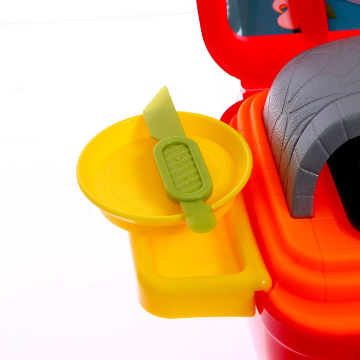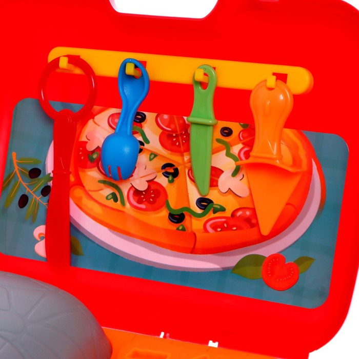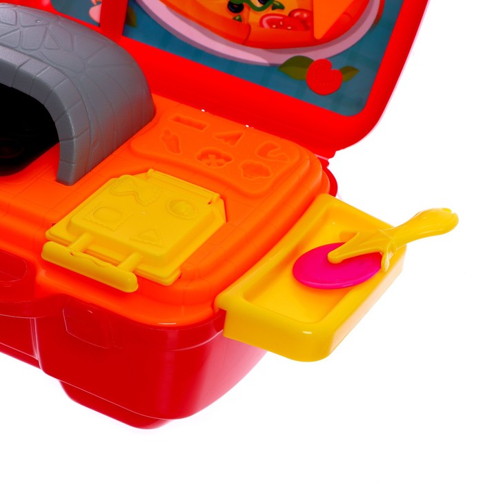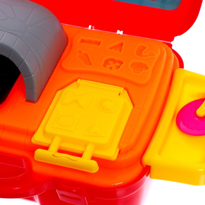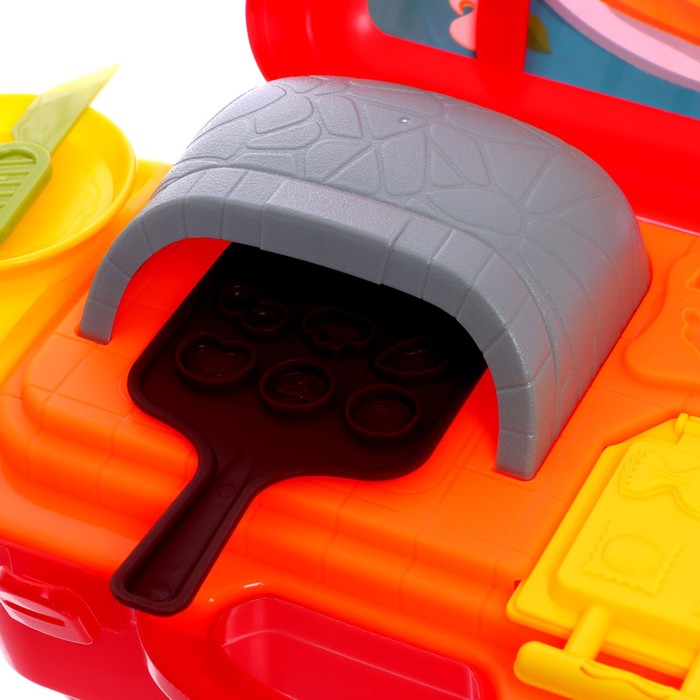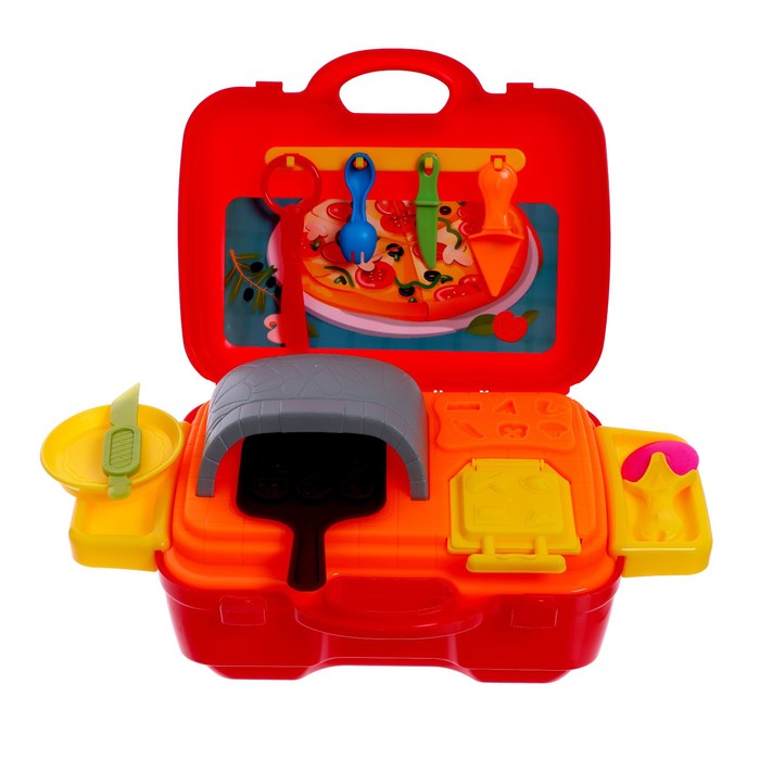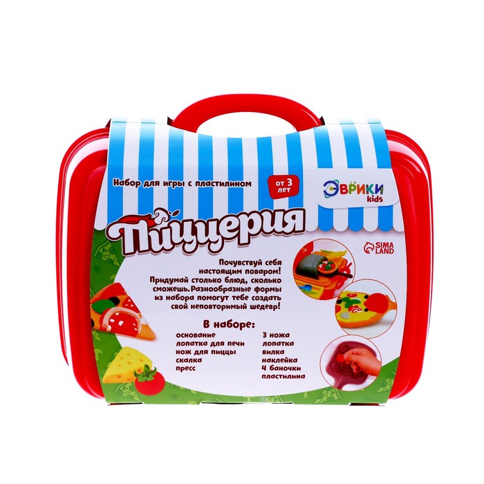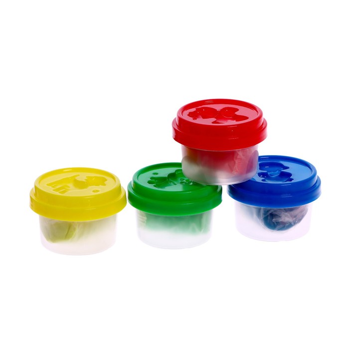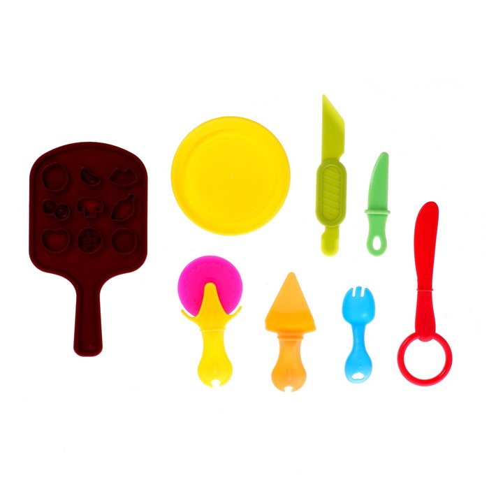 В комплект входит 5 баночек разноцветного пластилина, пресс-давилка, пресс-формочки, трафареты, а также посудка для игры.