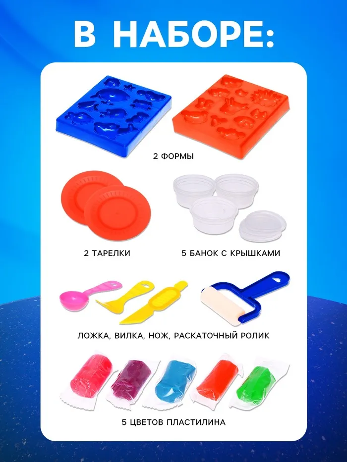 - 5 ярких баночек пластилина для лепки.