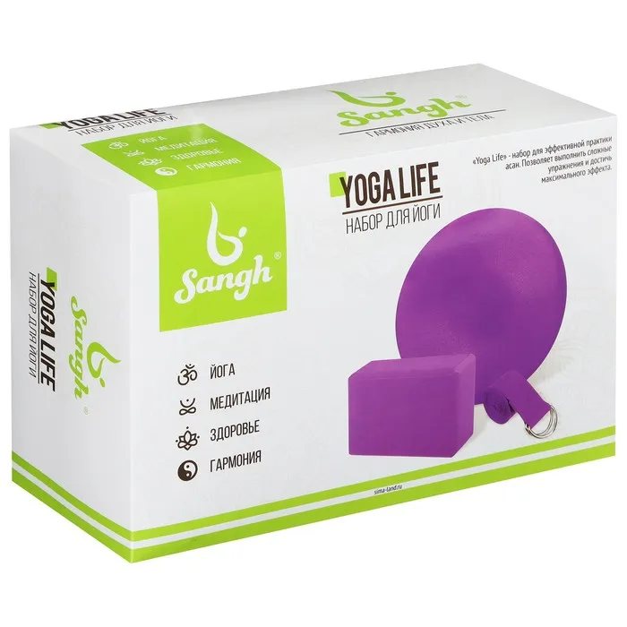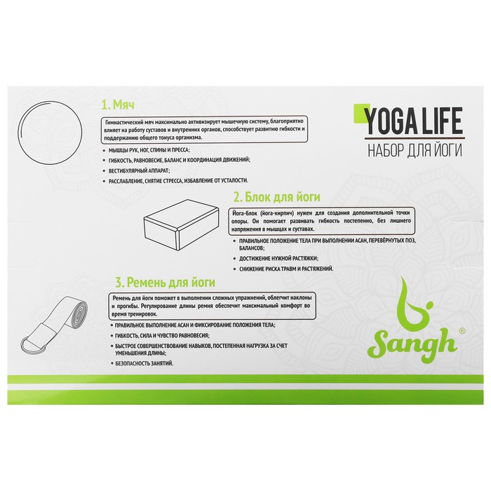 Комплект для йоги, который включает в себя блок, ремень и гимнастический мяч.
