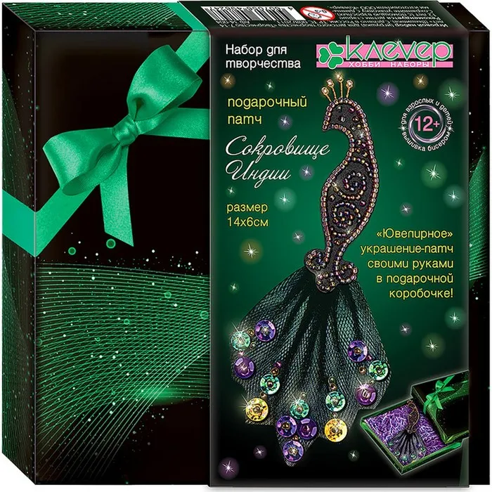 Набор для изготовления подарочного патча «Сокровище Индии» из серии «Подарочный патч» — это стильное украшение, которое можно создать своими руками. Он станет идеальным подарком в элегантной упаковке. Вышитый патч, стилизованный под ювелирное украшение в форме павлина, будет интересен как взрослым, так и подросткам от 12 лет с навыками шитья. Патч вышитый сверкающим бисерным узором по фетру, с декором из расшитого бисером и пайетками фатина, будет великолепно смотреться как украшение на платье и как подарок в красочной коробке с декоративным наполнителем.