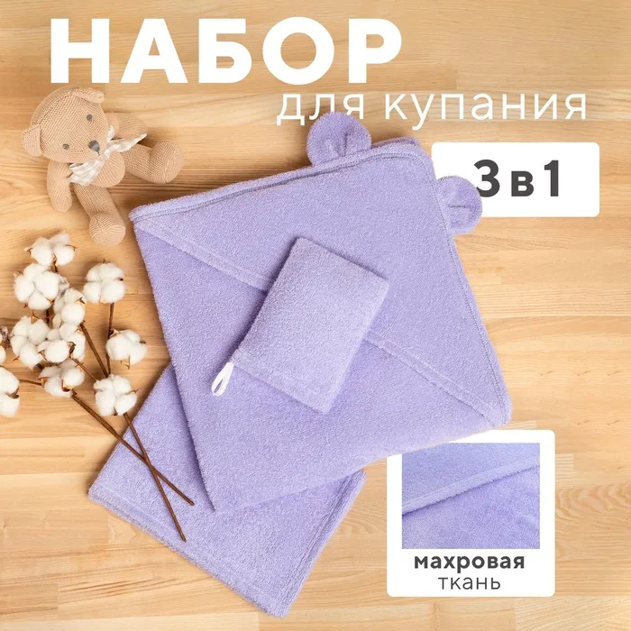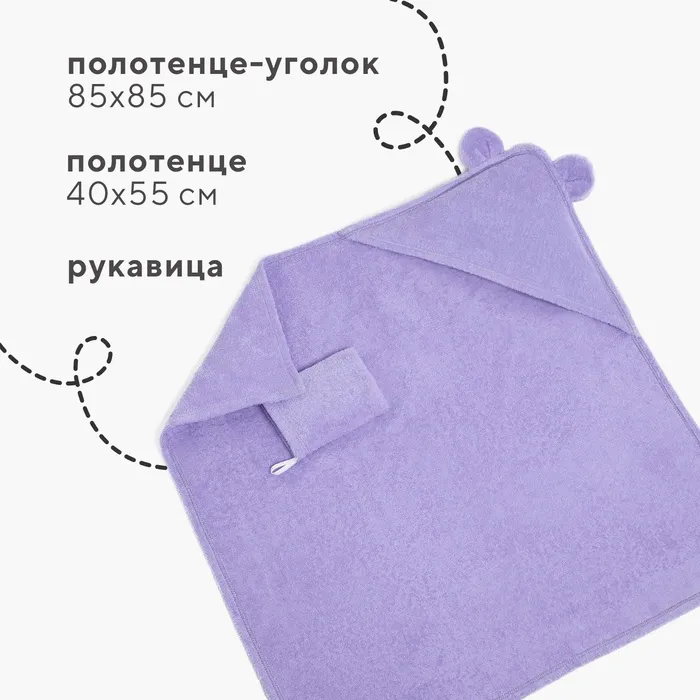 Набор для купания Крошка Я (полотенце-уголок 85*85±2см,полотенце 40*55см, рукавица), цвет сиреневый — Характеристики
