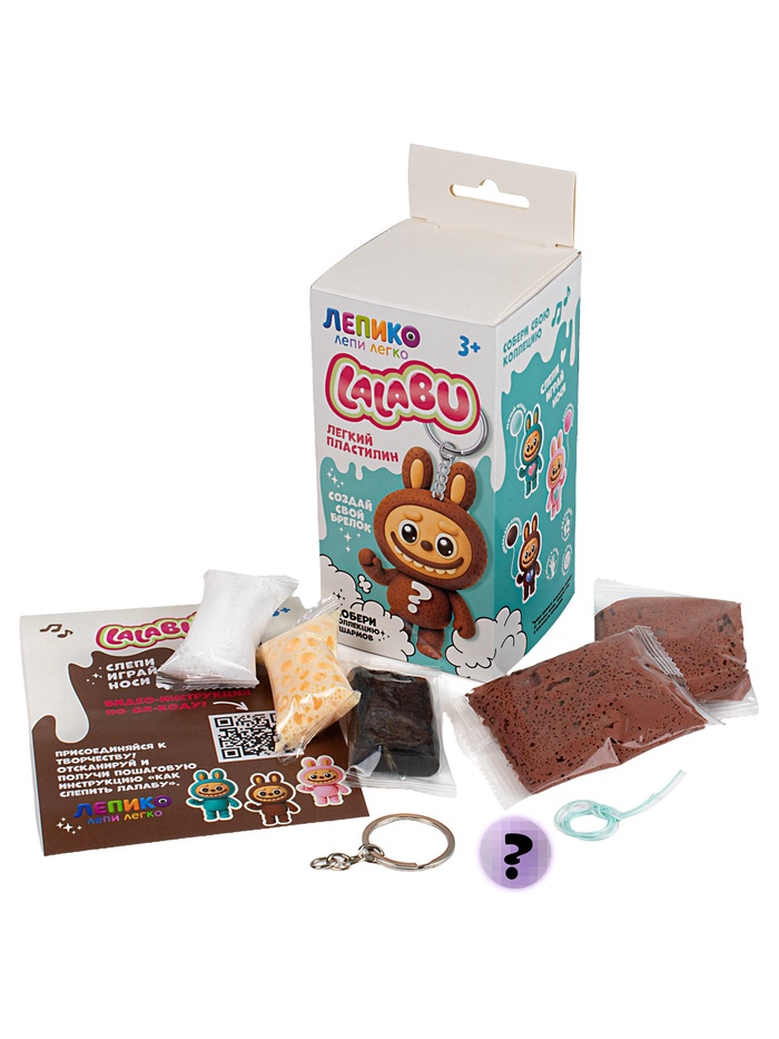 В наборе: легкий пластилин - 4 цвета; фурнитура (кольцо для брелока, шнурок); секретный шарм.
