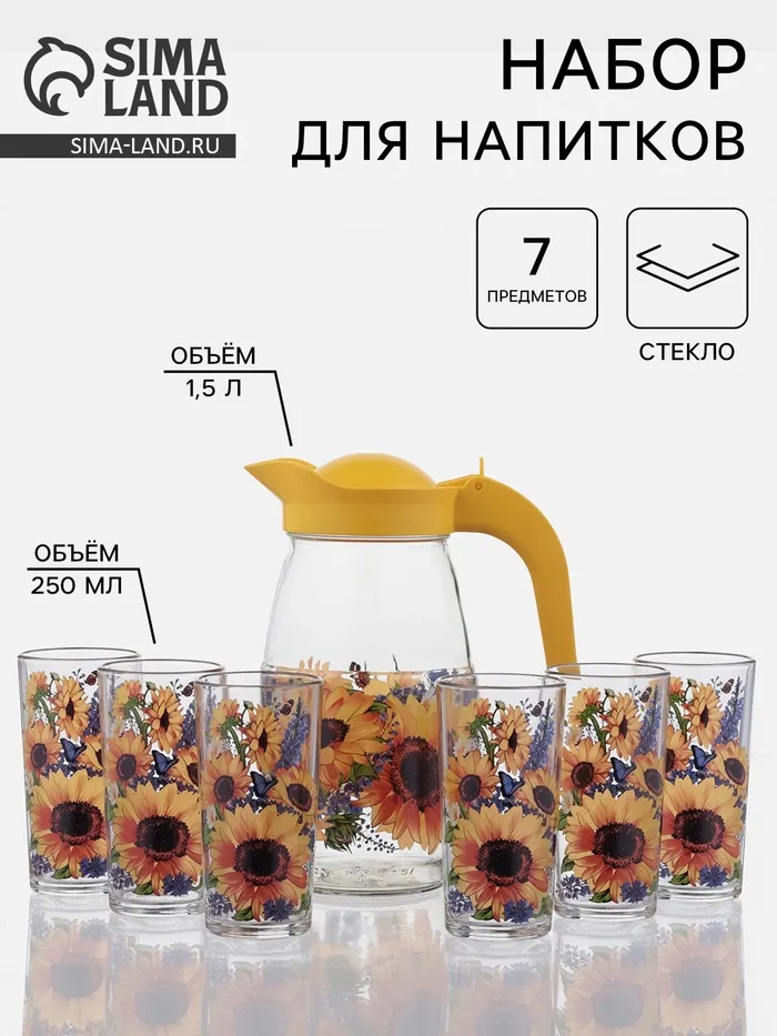 Набор для напитков «Подсолнух», 7 предметов: кувшин, 6 стаканов, стекло, прозрачный, жёлтый — Характеристики
