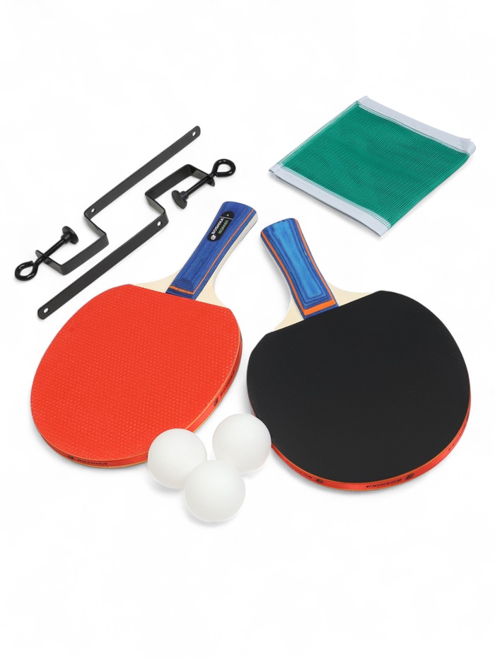 В набор входят 2 ракетки для настольного тенниса, 3 мяча и сетка с креплением.
