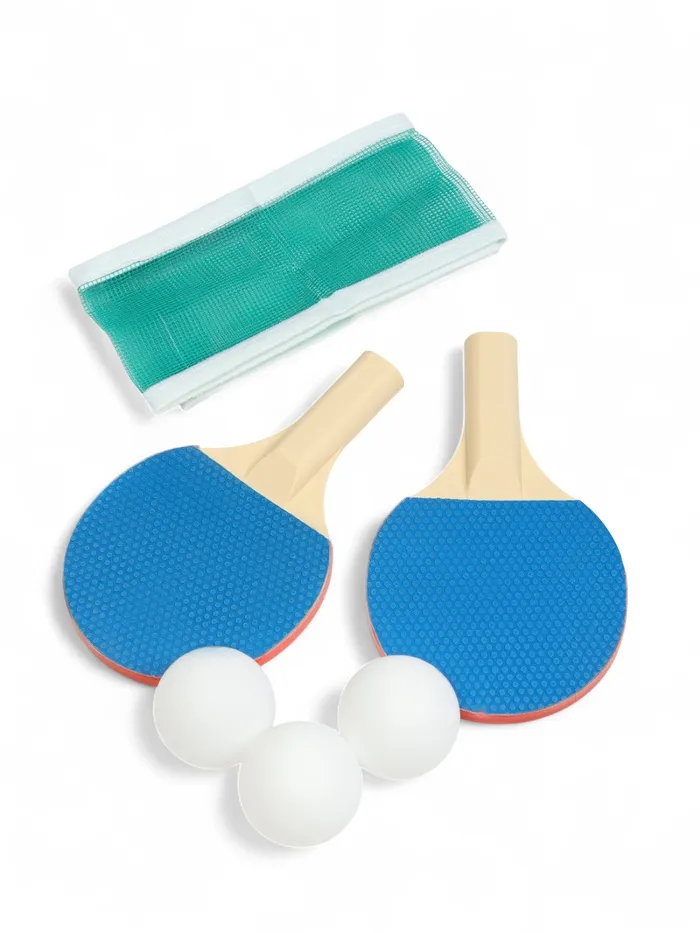 Детский комплект для настольного тенниса включает в себя: 2 ракетки, 3 мячика, сетку, 2 присоски и 2 штатива.