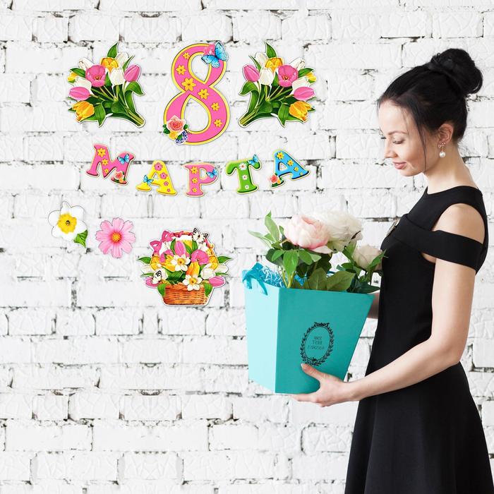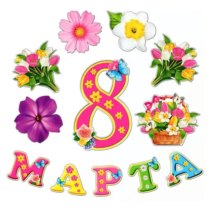 С помощью этого набора вы с легкостью оформите интерьер любого помещения (класс, холл, актовый зал) в торжественном стиле праздника 8 марта.
