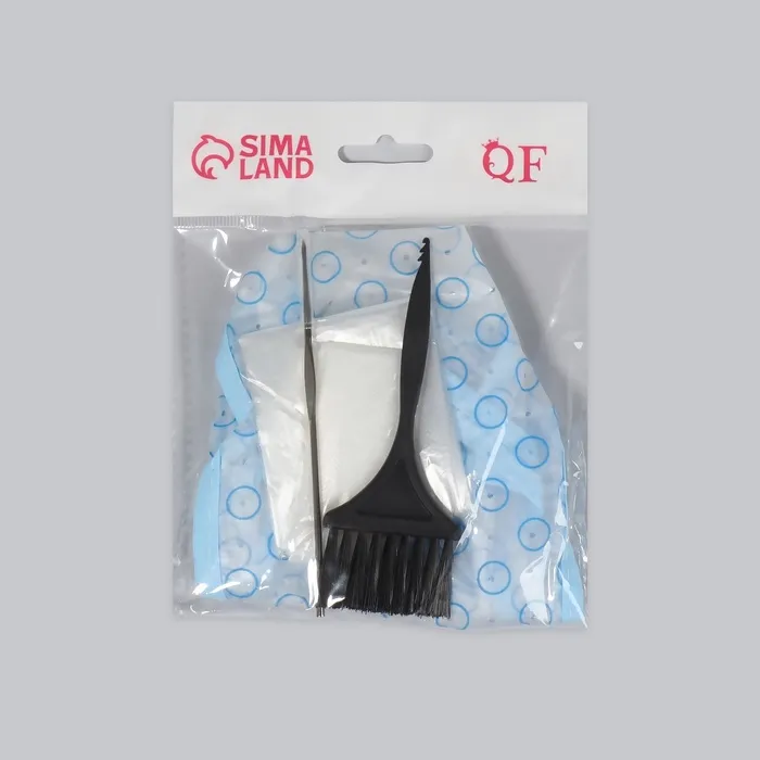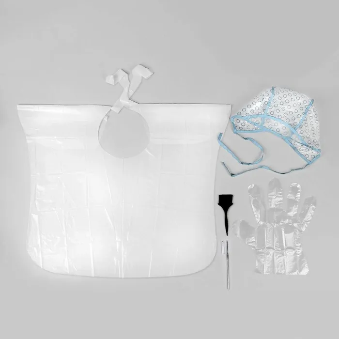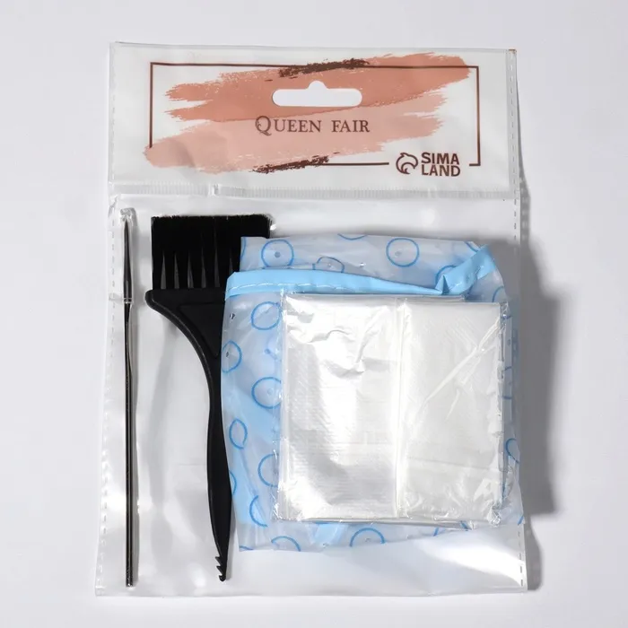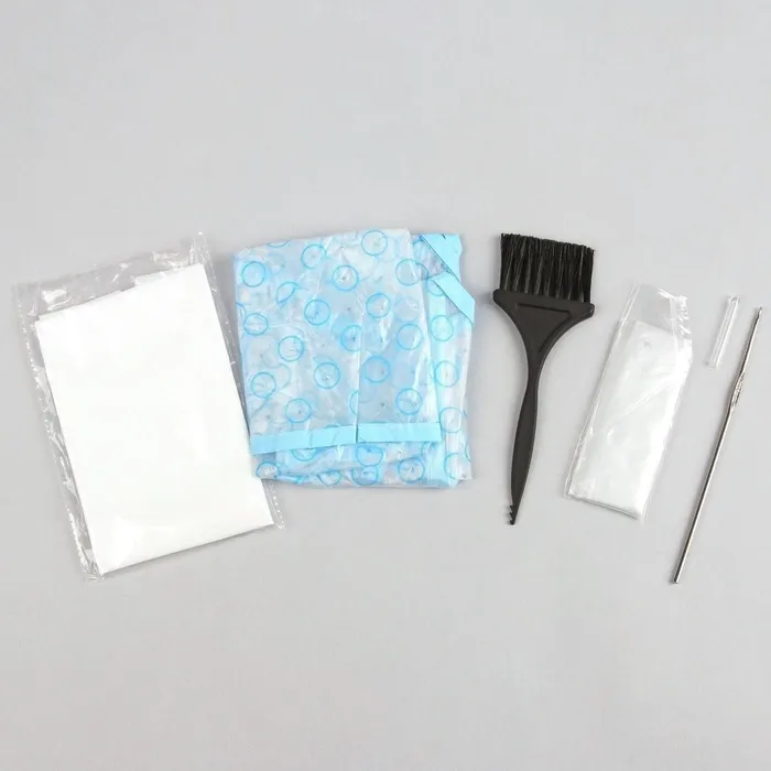 Набор идеально подойдет для окрашивания волос в домашних условиях. Состоит из 5 предметов - кисть, шапочка для мелирования, крючок, перчатки, пелерина. Кисть оснащена синтетической щетиной, ручка удлиненная, что позволяет окрашивать быстро и качественно. Шапочка для мелирования вместе с крючком помогут выделить необходимые пряди под окрашивание без затруднений. Перчатки защитят кожу рук от попадания краски и других составов на кожу. Пелерина обезопасит одежду.