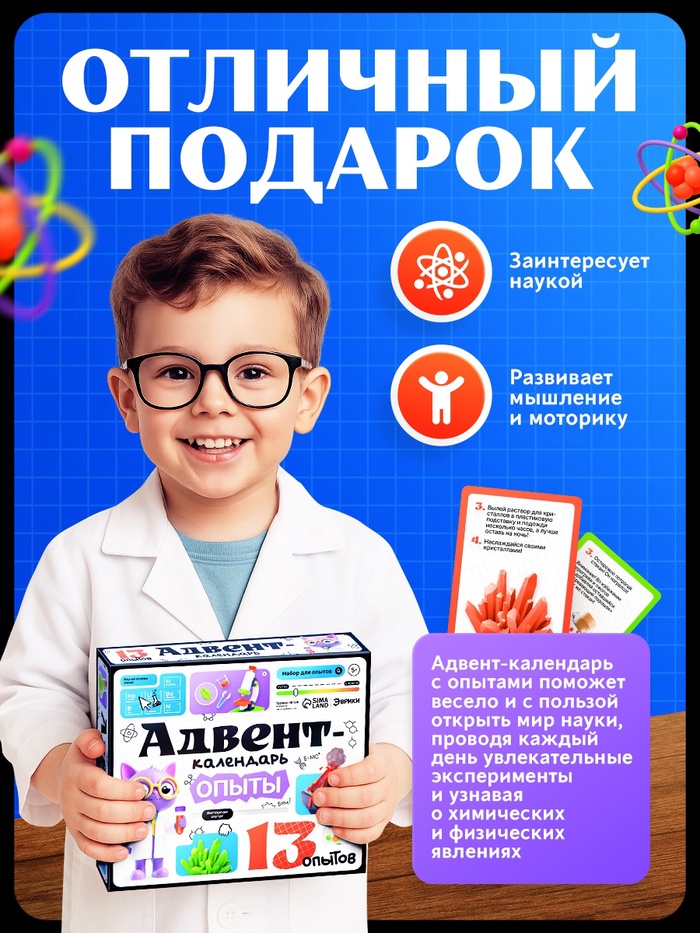 Интерес с продолжением: Адвент-набор с химическими опытами подойдёт детям, которые любят эксперименты и задают вопросы “почему?”. Он помогает превратить любопытство в системное мышление и делает первые шаги в науку спокойными и увлекательными. Универсальный формат для мальчиков и девочек, которые готовы открывать новое день за днём.