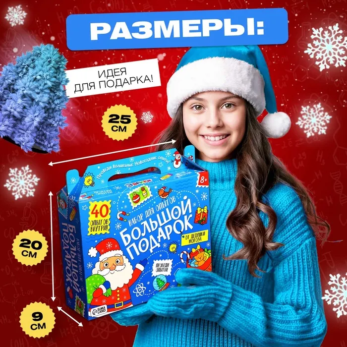 С набором для опытов «Большой новогодний подарок» — то, что нужно для полезного и интересного досуга! Такой подарок поможет ребёнку скрасить ожидание Нового года, а также позволит провести целых 40 увлекательных опытов!