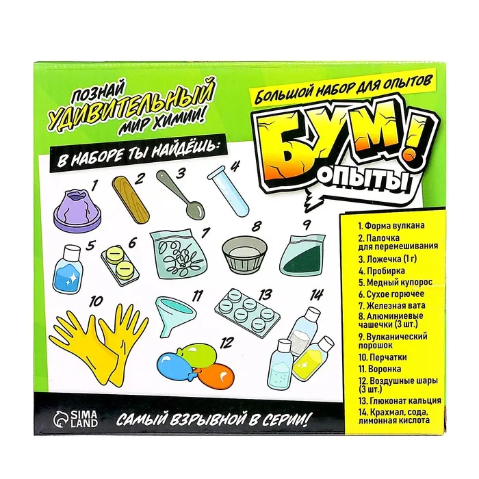 Набор для опытов «Бум-опыты» — увлекательный способ познакомить ребёнка с окружающим миром и научить его проводить собственные эксперименты. Каждый опыт представлен в интересной и доступной форме, что позволяет юному учёному легко воспринимать информацию и учиться новому. С помощью этого набора ребёнок разовьёт навыки наблюдения, логического мышления и творческого подхода к решению задач.