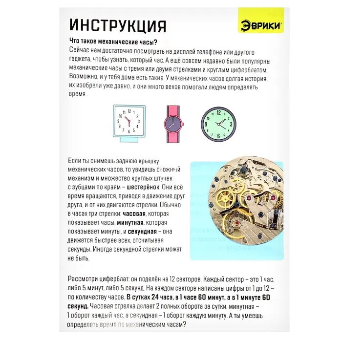 С помощью подробной инструкции каждый малыш соберёт настоящий часовой механизм и узнает принцип работы механической шестерёночной передачи.