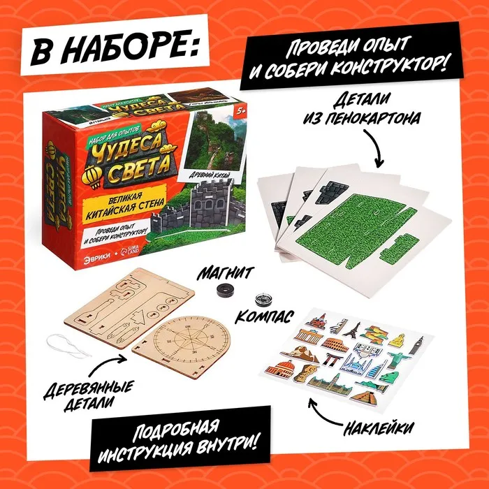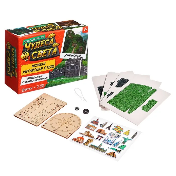 С набор для опытов «Чудеса света: Великая Китайская стена» ребёнок своими руками соберёт самодельный компас и модель Великой Китайской стены, узнает интересные факты о Древнем Китае и выполнит интересные задания.