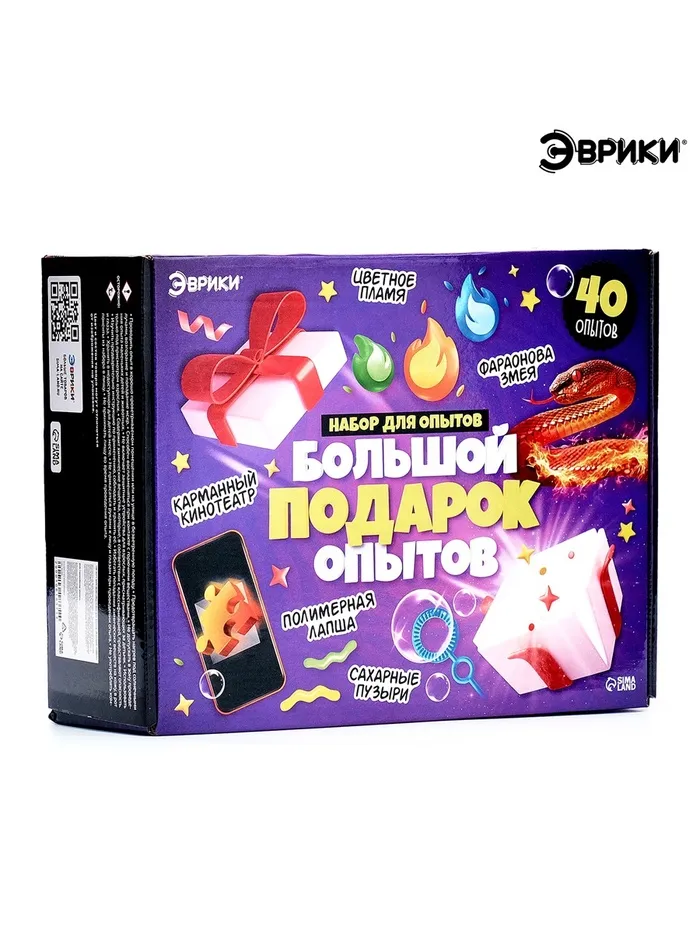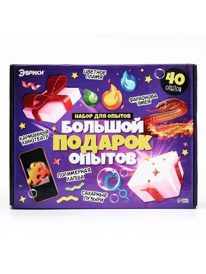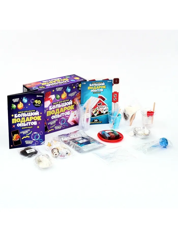 Набор для детских экспериментов «Большой подарок» — это увлекательный комплект, включающий 40 различных опытов, предназначенный для детей от 6 лет. Он помогает развивать аккуратность, визуальное восприятие и внимание.