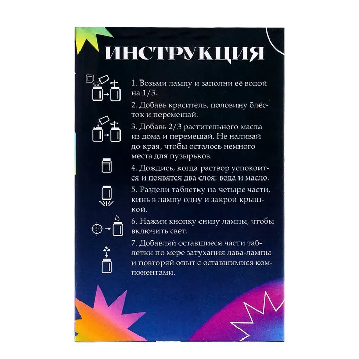 Набор для создания лавовой лампы – это увлекательный эксперимент, который превратит процесс познания в настоящее волшебство. Ребёнок самостоятельно проведёт химический опыт и увидит, как в воде рождаются магические пузыри, словно светящиеся капли лавы. Набор подойдёт для творческого досуга, научных экспериментов и совместных игр с друзьями или родителями.