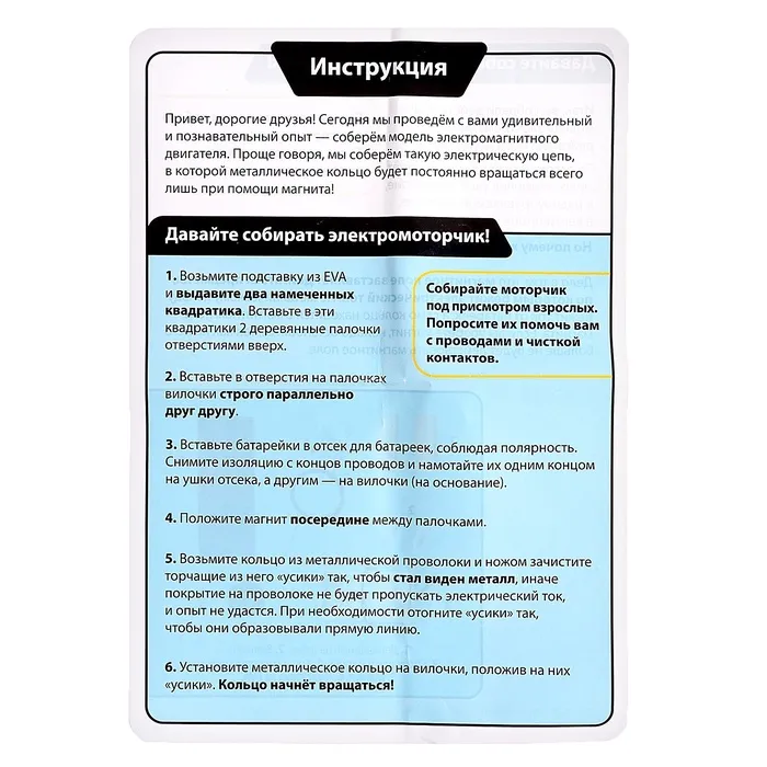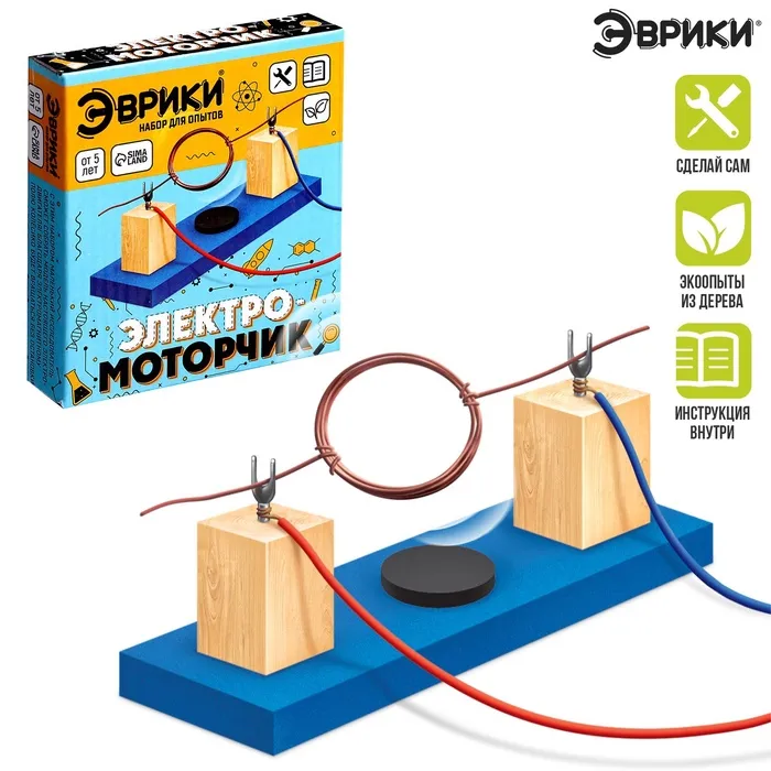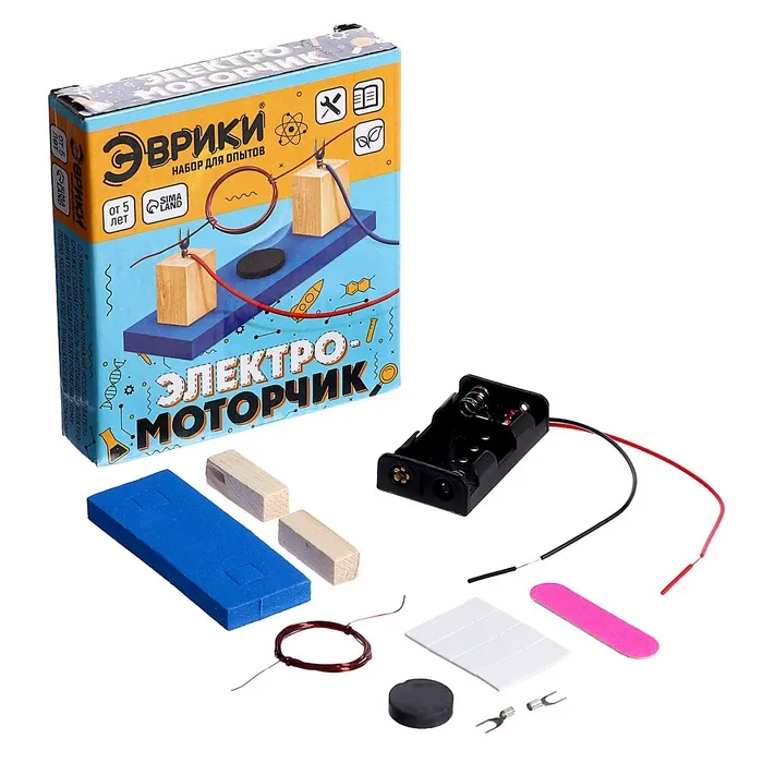 Собери работающий электродвигатель своими руками! Набор для опытов «Электромоторчик» – это практическое пособие по изучению основ электротехники. С помощью этого комплекта ребенок соберет настоящий действующий мотор из экологичных материалов.