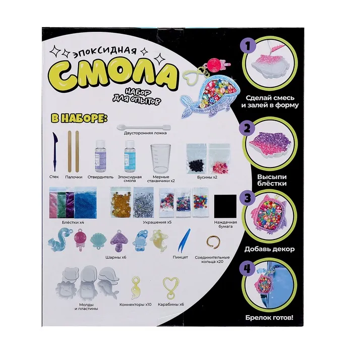 Набор для опытов «Эпоксидная смола» — идеальное решение для занятия творчеством! Ребёнок проведёт увлекательный эксперимент и создаст уникальные брелоки из эпоксидной смолы!