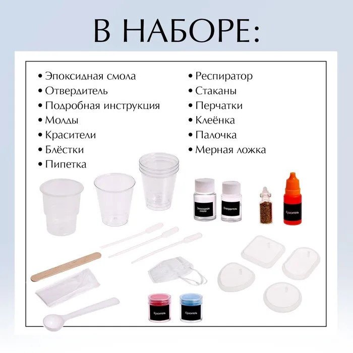 - В комплекте вы найдёте все необходимые инструменты и материалы: смолу, отвердитель, инструкцию, молды, красители, блёстки, пипетку, респиратор, стаканы, перчатки, клеёнку, палочку, мерную ложку.