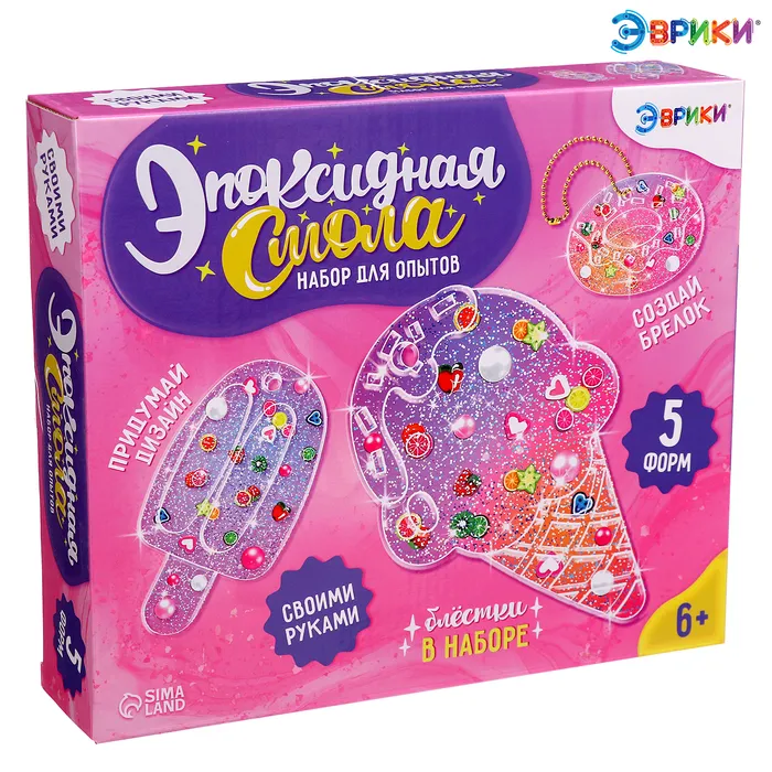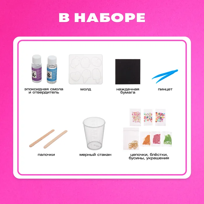 Набор для опытов «Эпоксидная смола» — идеальное решение для занятия творчеством! Ребёнок проведёт увлекательный эксперимент и создаст уникальные украшения из эпоксидной смолы!