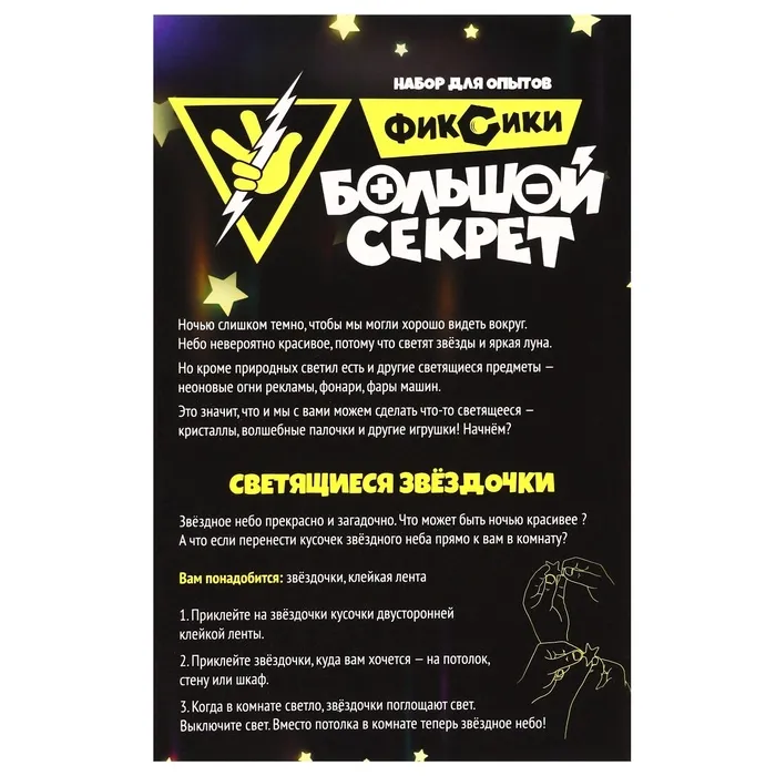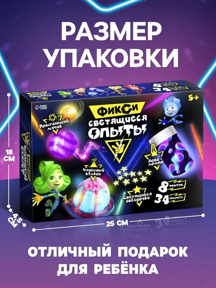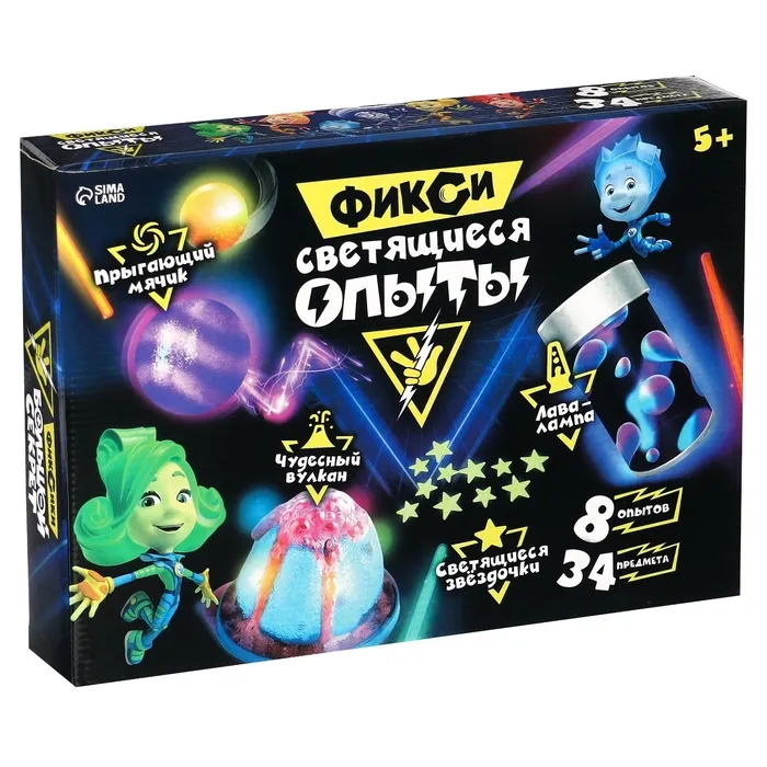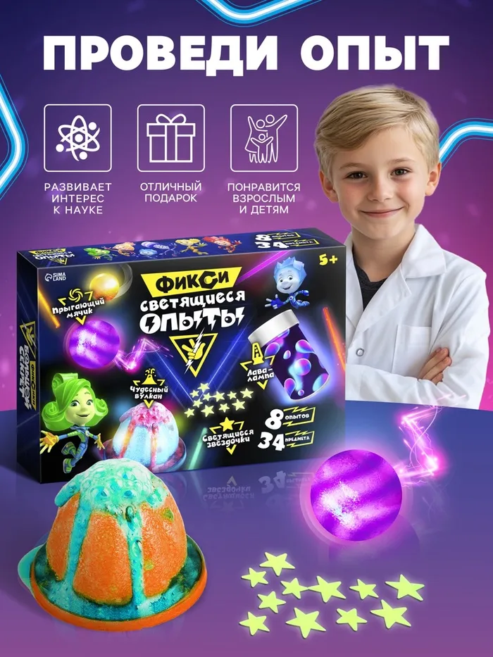 С набором для опытов «Светящиеся опыты» ребёнок проведёт 8 увлекательных экспериментов со светом, в результате которых у ребёнка появятся необычные игрушки.