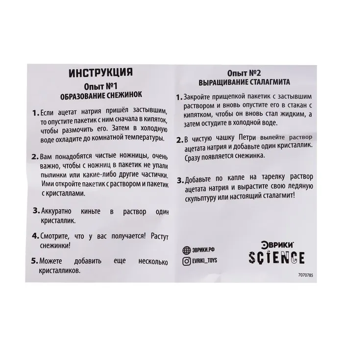 Набор для экспериментов «Горячий лёд» — это увлекательный способ познакомить детей с удивительными свойствами химических реакций. С его помощью можно наблюдать, как горячий раствор превращается в «лёд», оставаясь при этом тёплым.