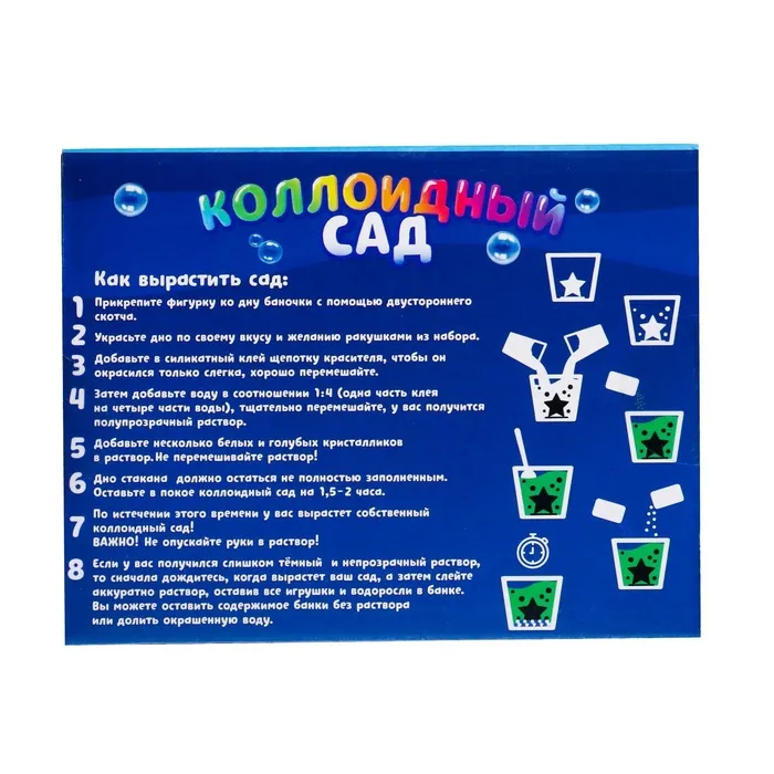 В наборе «Коллоидный сад» вы найдёте баночку, фигурку и остальные компоненты для проведения опыта.