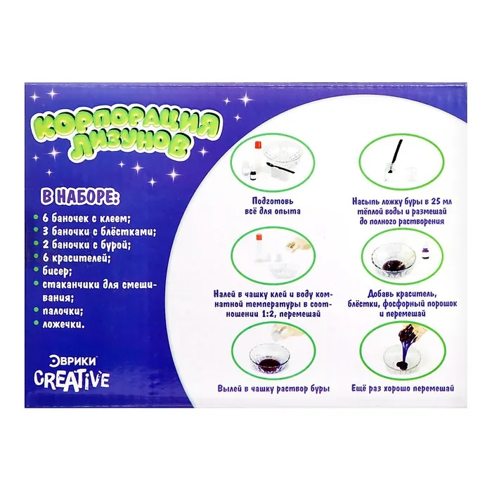 С набором «Эврики» ребёнок проведёт увлекательные эксперименты по химии и самостоятельно изготовит 6 разноцветных лизунов, которые будут блестеть и светиться в темноте.