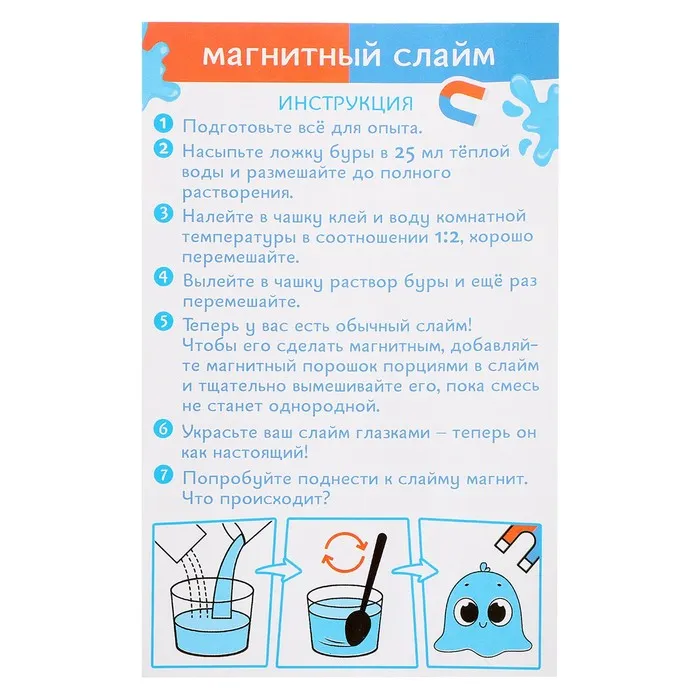 Набор для опытов «Магнитный слаймик» позволит ребёнку провести увлекательный эксперимент по химии и создать ароматизированный слайм своими руками.