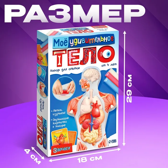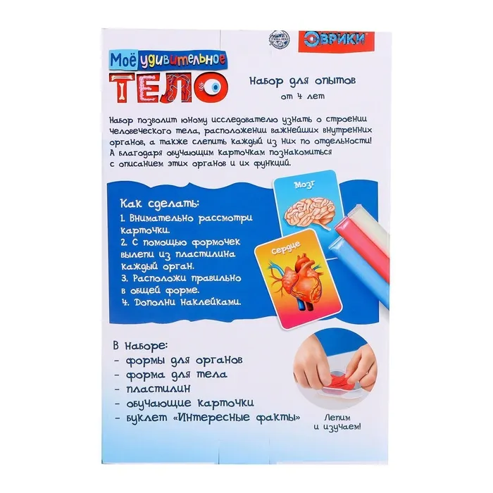 С набором для опытов «Моё удивительно тело» юный исследователь узнает о строении человеческого тела и о расположении важнейших внутренних органов, а также слепит каждый из них по отдельности. А обучающие карточки познакомят ребёнка с описанием органов и их функций.