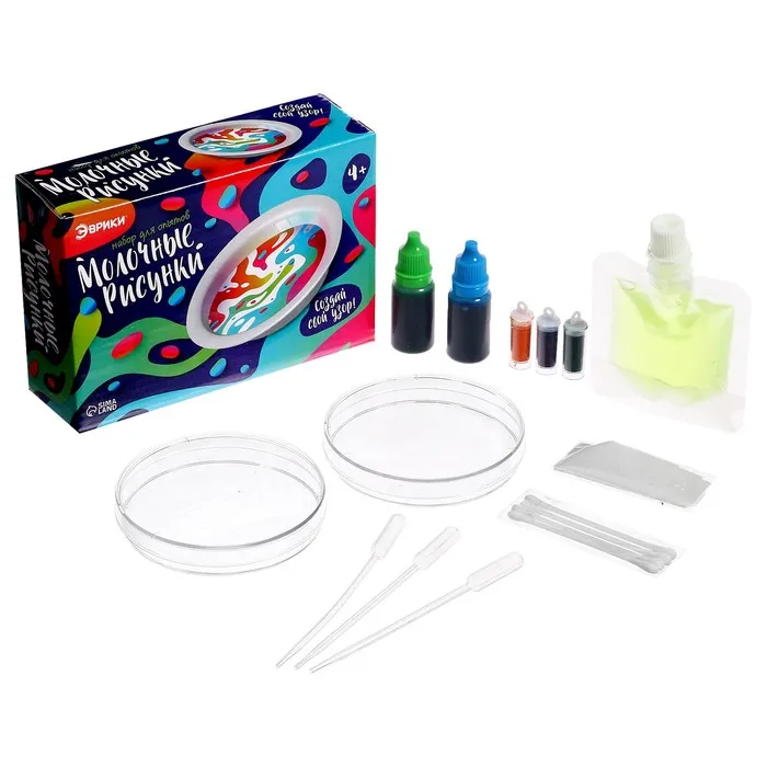 Набор для опытов «Молочные рисунки» разработан по древнему восточному методу рисования — эбру. Такой опыт поможет ребёнку освоить оригинальную технику, а также вызвать интерес к изобразительному творчеству и потренировать воображение.