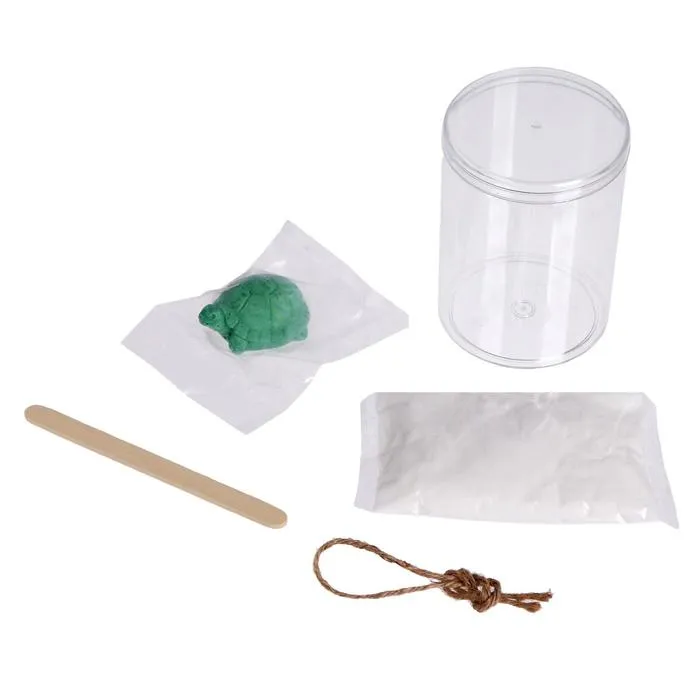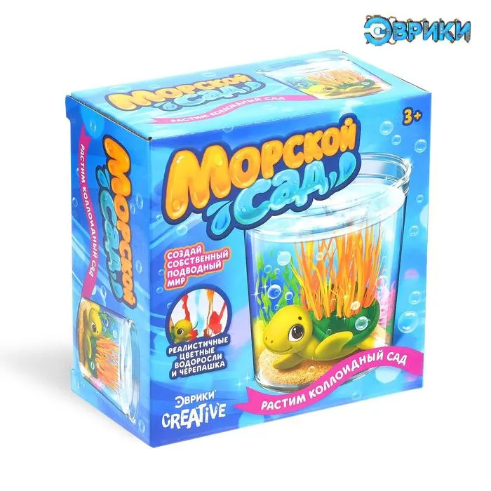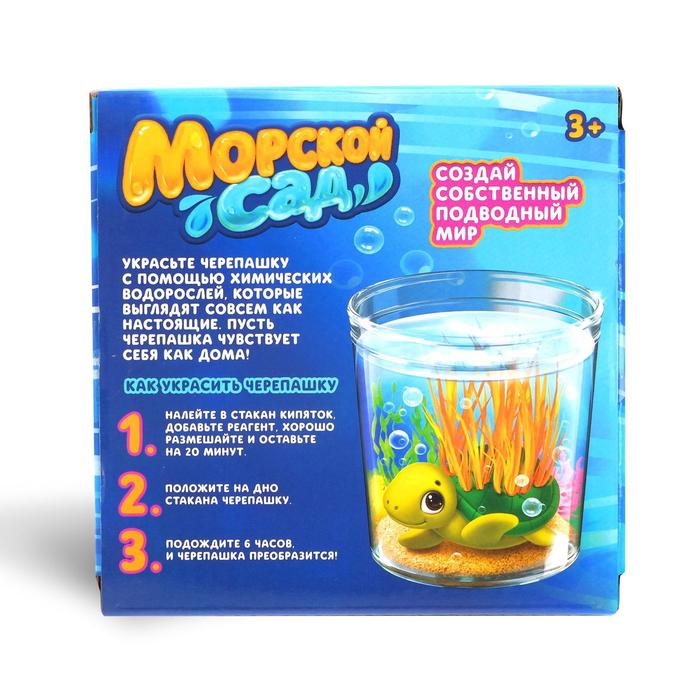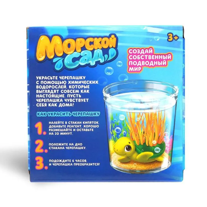 В наборе «Морской сад» вы найдёте баночку, фигурку черепашки и реагент. Добавьте реагент в баночку с водой и черепашкой и через 6 часов вы будете наблюдать чудо химической реакции — в ёмкости появится чудесный сад из водорослей!