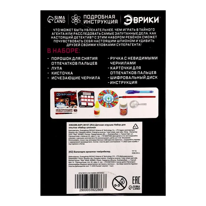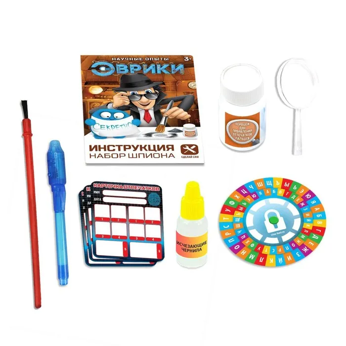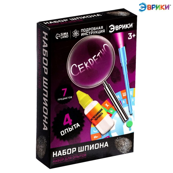С набором шпиона торговой марки «Эврики» ребёнок представит себя секретным агентом, научится снимать отпечатки пальцев, разработает тайный алфавит и изобретёт невидимые чернила.