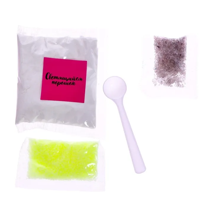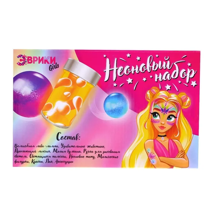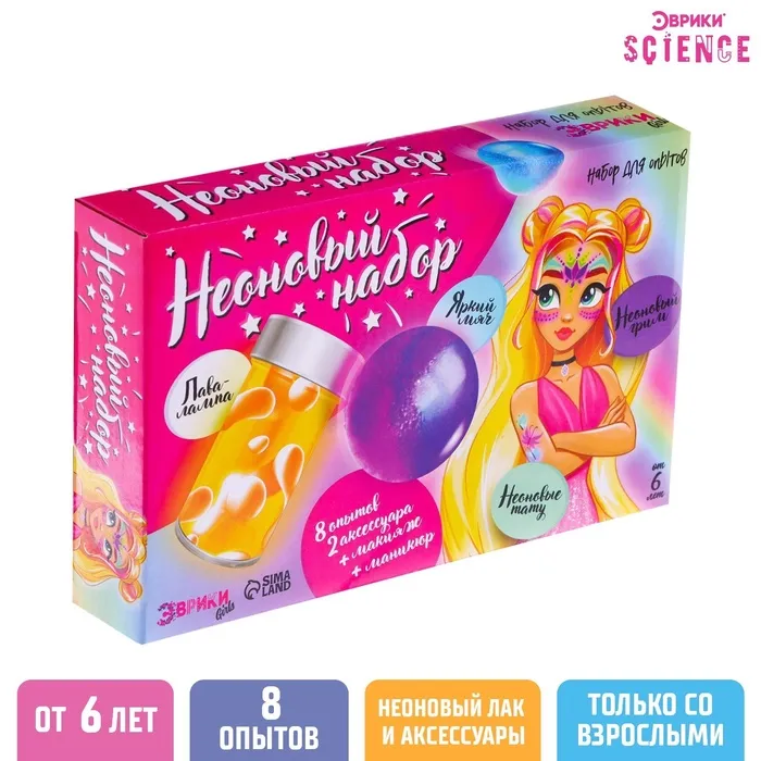 Набор для опытов «Неоновый набор» ребёнок проведёт 8 интересных экспериментов, в результате которых у малышки появятся необычные игрушки. А также сделает красивый макияж и необычный маникюр.