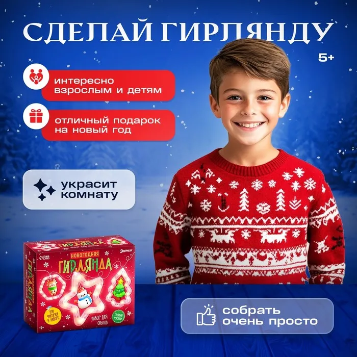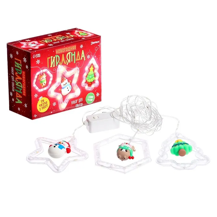 Набор для создания новогодней гирлянды с тремя фигурками станет отличным подарком для детей от 4 лет. Этот увлекательный комплект позволяет самостоятельно собрать праздничную гирлянду, развивая творческие способности и мелкую моторику.