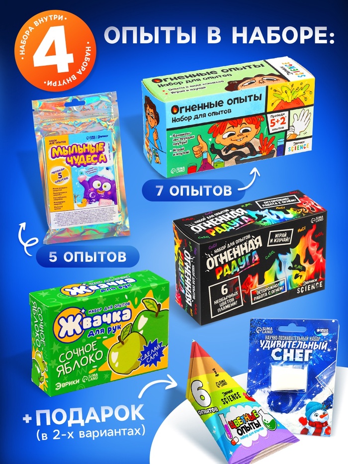 Этот праздничный комплект собрал в себе яркие, эффектные и безопасные эксперименты, которые позволят ребёнку почувствовать себя настоящим исследователем. Внутри коробки — сразу четыре полноценных набора для опытов и дополнительный новогодний сюрприз. Все эксперименты подобраны так, чтобы увлечь ребёнка зрелищными реакциями, знакомыми ароматами и красочными превращениями. Это отличный способ совместить игру, творчество и первые шаги в мире химии.
