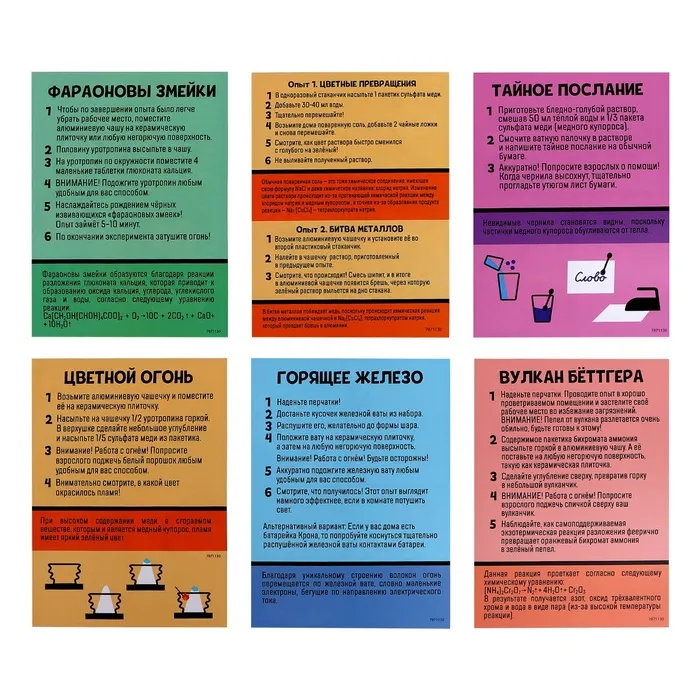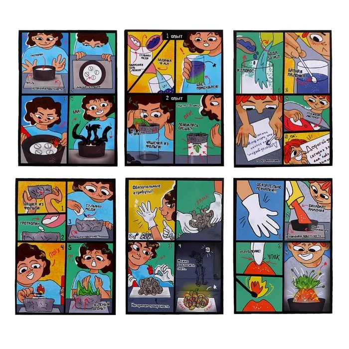 Каждый опыт сопровождает красочная инструкция в стиле комикса с подробным описанием каждого шага и объяснением реакции.
