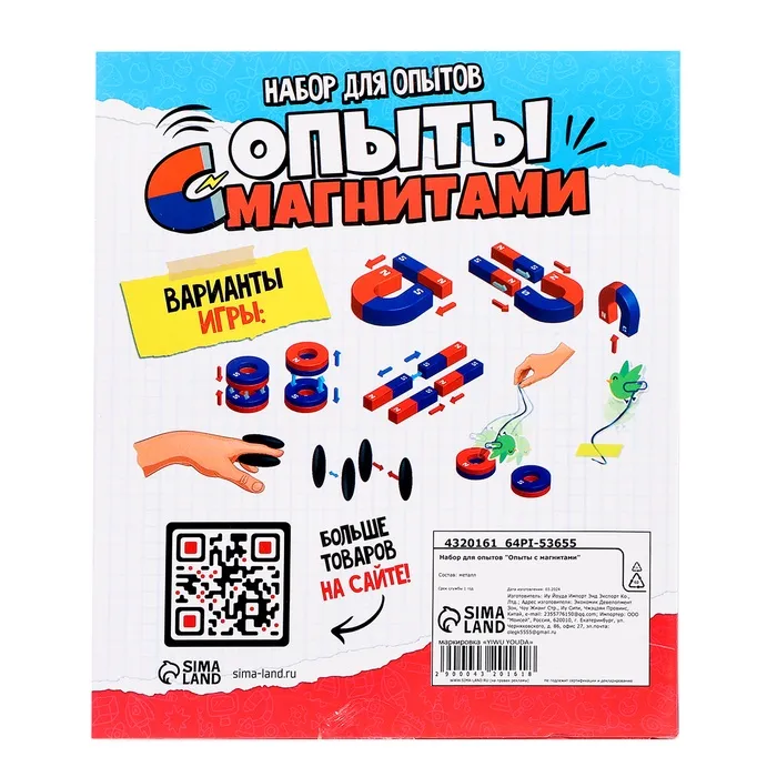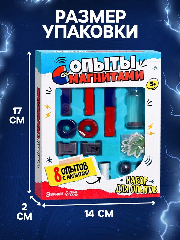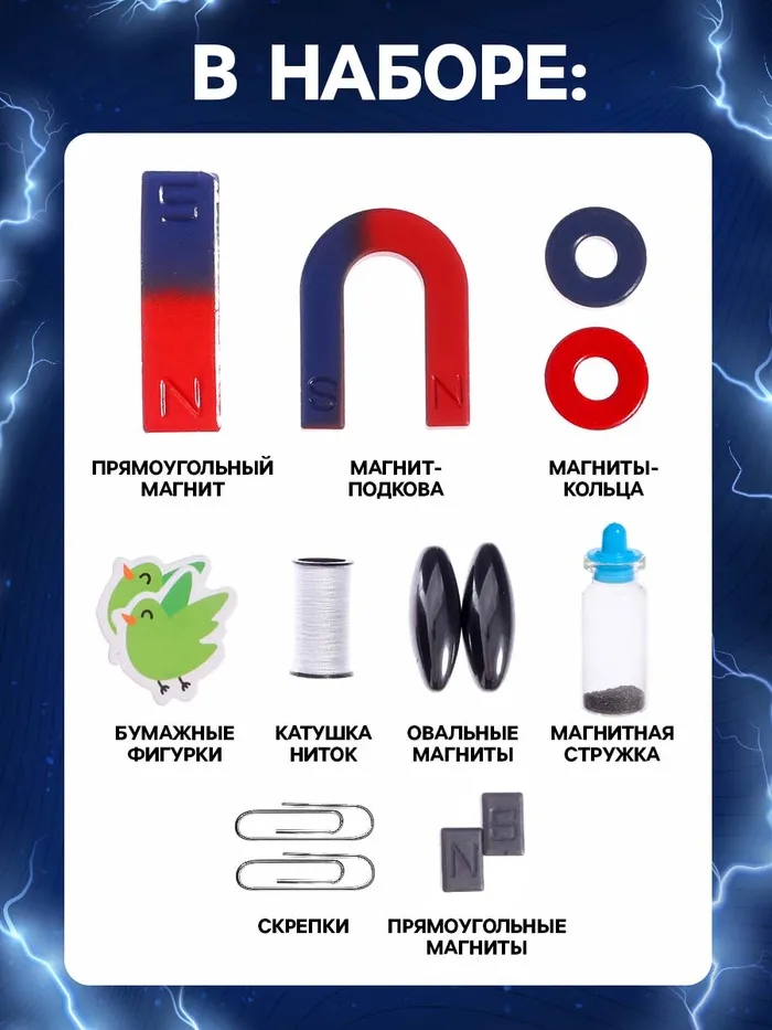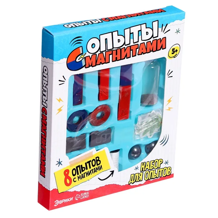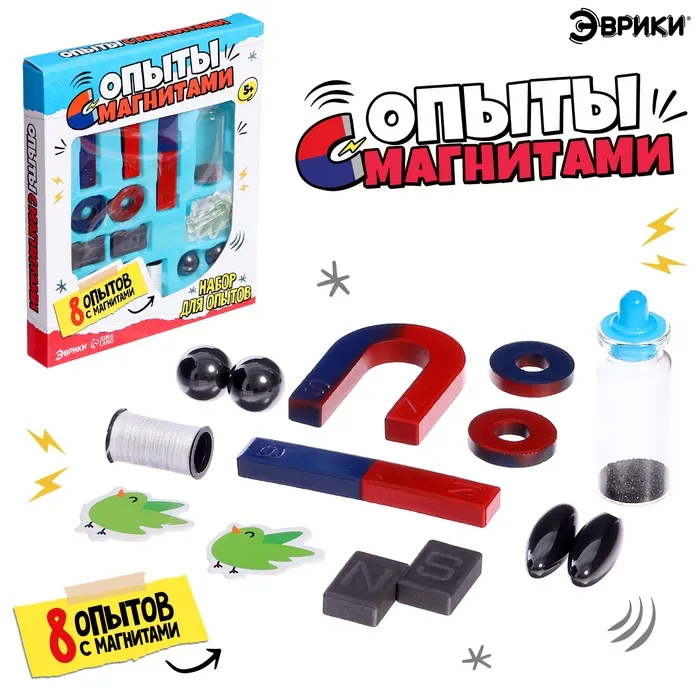 Набор для опытов «Опыты с магнитами» — это уникальная возможность для детей от 5 лет познакомиться с основными законами физики через увлекательные эксперименты. В комплект входят 10 магнитов и катушка ниток, которые позволят провести 8 различных опытов.