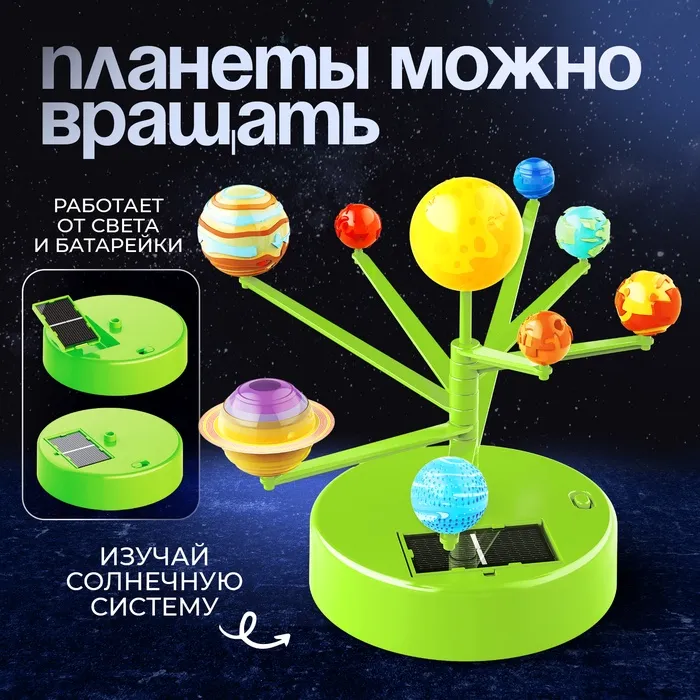 - Планетарий работает от двух источников энергии: от света или одной батарейки типоразмера AA.