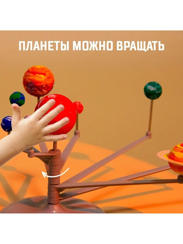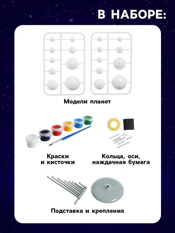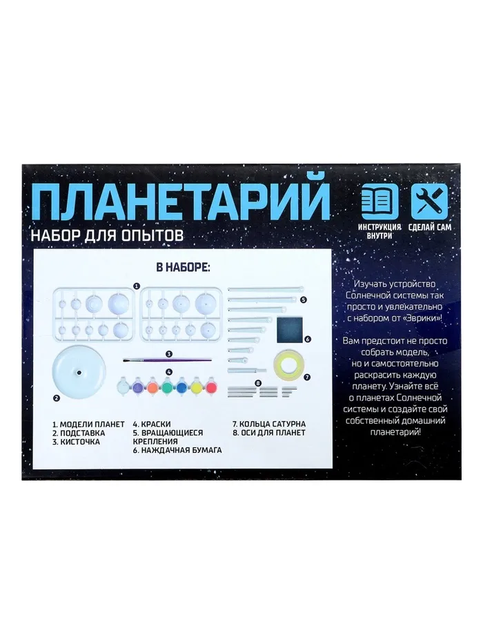 Соберите планеты Солнечной системы и раскрасьте их с помощью кисточки, ориентируясь по рисунку на упаковке. После того как небесные тела будут окрашены, установите готовые планеты на специальный держатель — модель Солнечной системы готова!