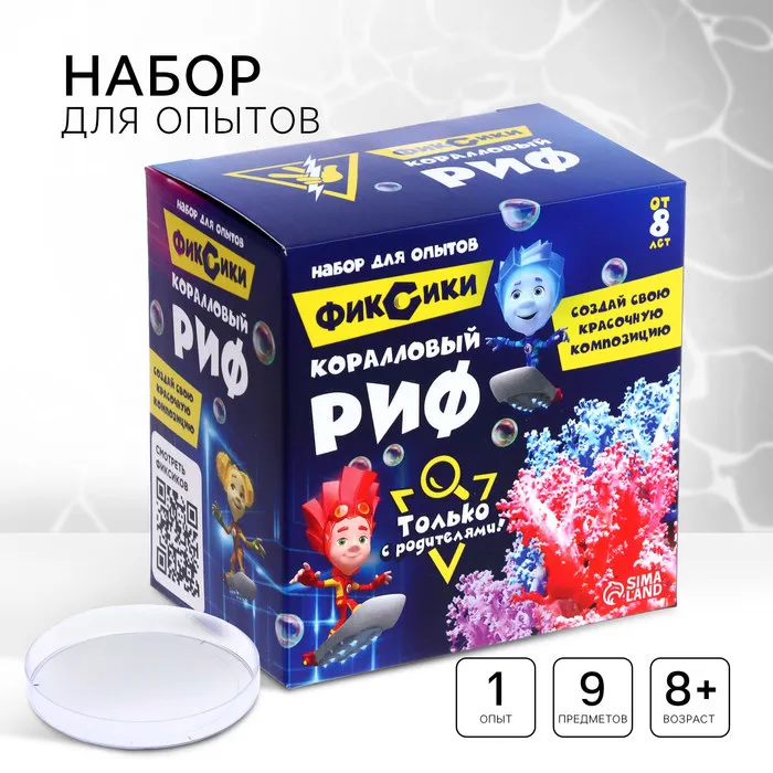- 5 специальных предметов: в набор входят безопасные реактивы, инструменты и защитные аксессуары — всё для первого химического опыта.