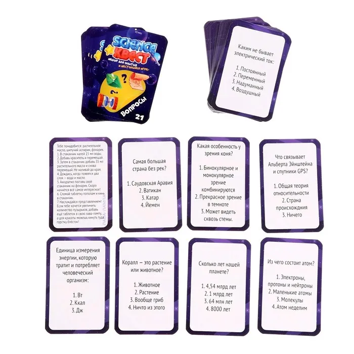 - 55 тематических карточек: Включают три типа заданий: практические эксперименты, познавательные викторины и проверочные тесты. Возможность комбинировать карточки создает бесконечные варианты игры.
