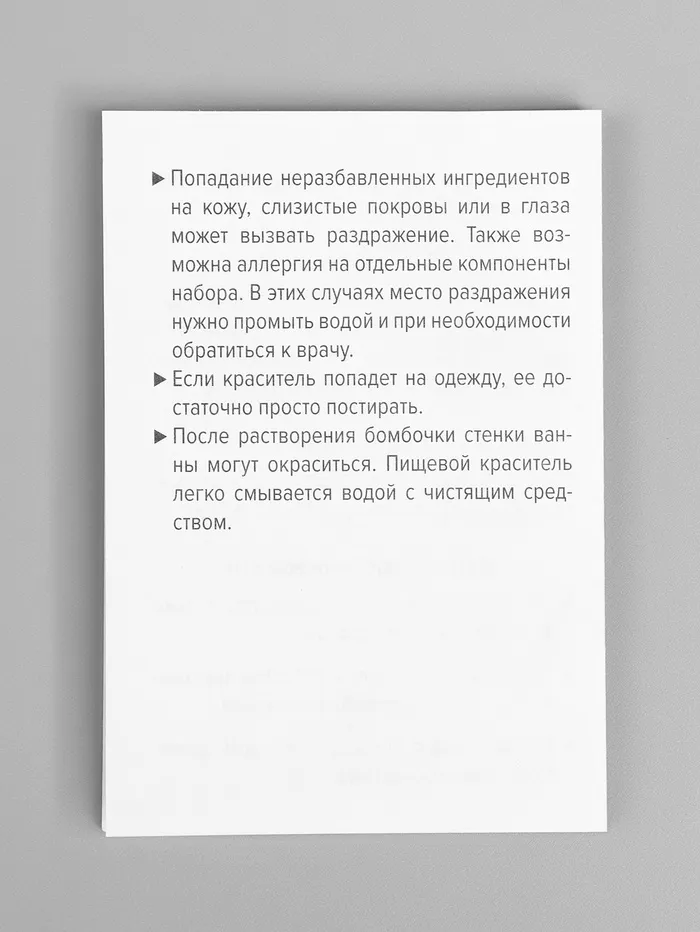 После растворения бомбочки стенки ванны могут окраситься. Пищевой краситель легко смывается водой с чистящим средством."