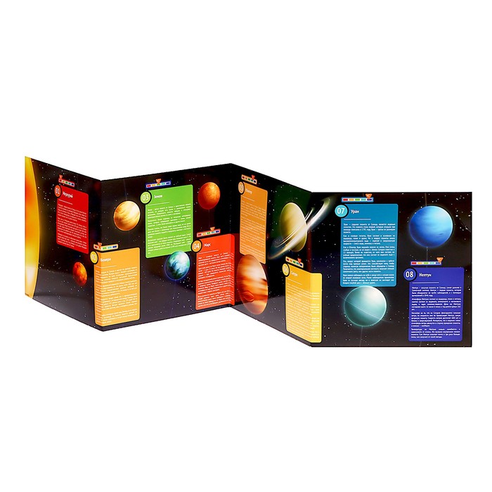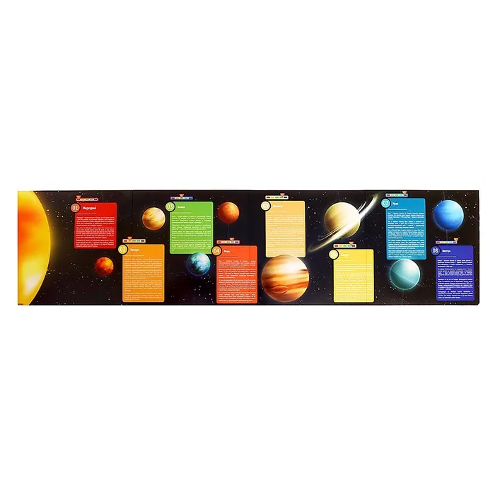 Карта отображает, в каком порядке расположены планеты и как далеко они находятся от Солнца. На карте есть подробное описание к каждой планете. Также в комплект входит 9 карточек c заданиями: ребус, вопросы, создание ракеты и т.д.