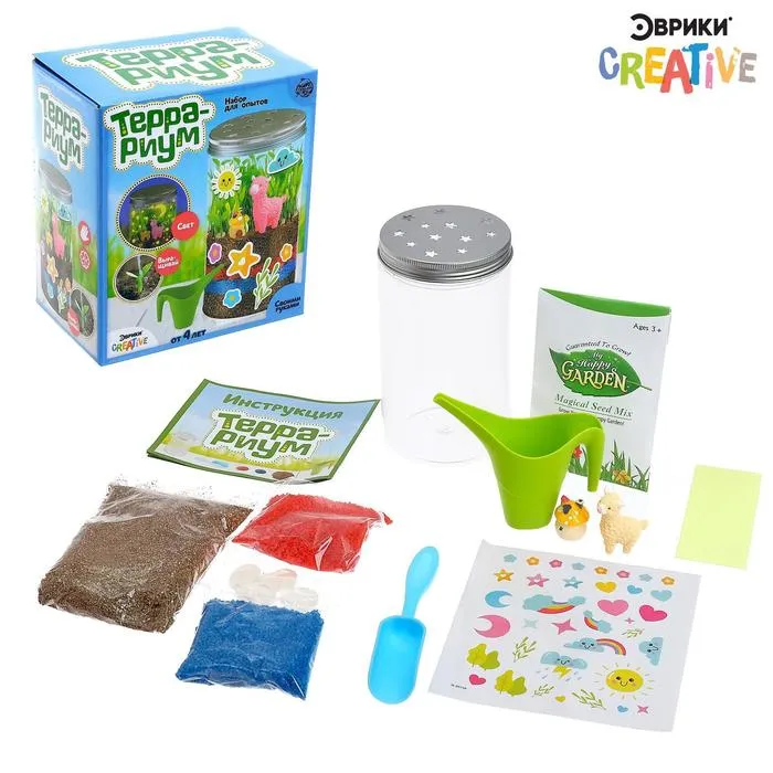 Такой набор станет отличным подарком для ребёнка, который любит эксперименты и хочет попробовать себя в роли настоящего садовода. Волшебные светящиеся наклейки сделают террариум особенным, а сам процесс ухода за ним принесёт много радости и гордости за результат!
