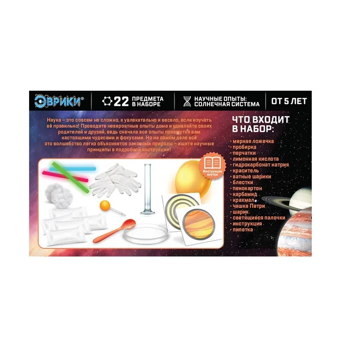 С набором для опытов «Эврики» ребёнок узнает об удивительных свойствах веществ, проведёт несколько интересных экспериментов, связанных с особенностями одной из планет Солнечной системы.