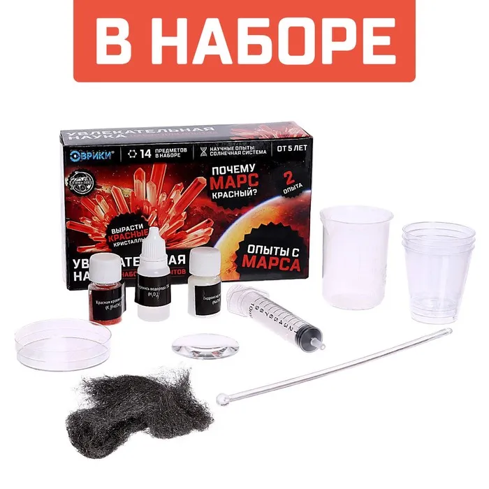 С этим набором для опытов ребёнок проведёт 2 научных и увлекательных экспериментов. Узнает почему Марс красный и вырастит кристаллы!