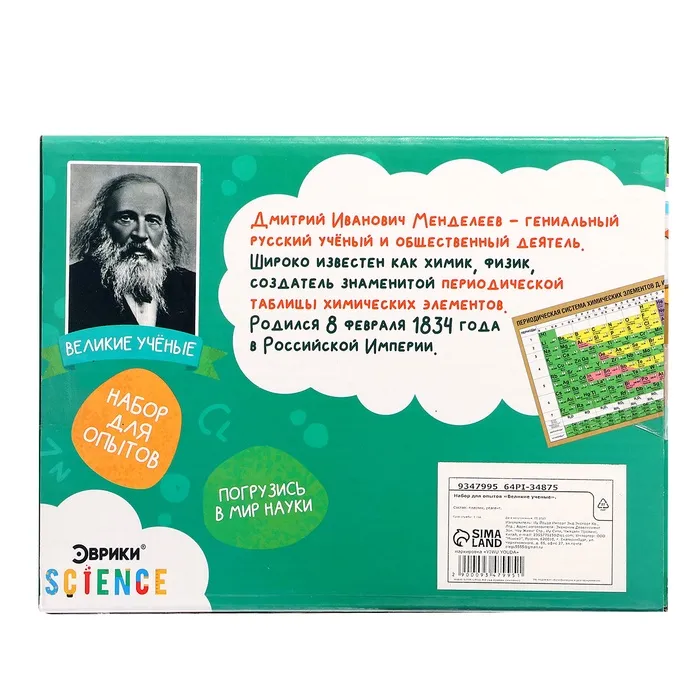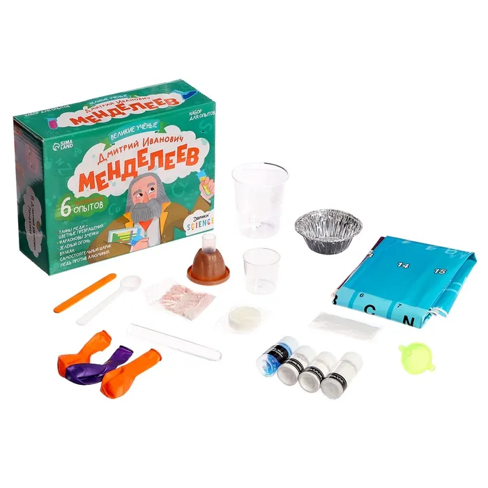 Набор для проведения химических опытов «Великие учёные: Дмитрий Менделеев» станет отличным подарком для юных исследователей. Он предлагает провести 6 увлекательных экспериментов, погружая детей в мир химии и знакомя их с открытиями великого учёного.